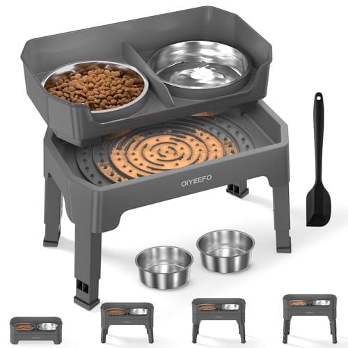 3 in 1 Large Elevated Dog Bowls: 4 Adjustable Height Raised Dog Bowl Stand with Mess Proof Design -Licking Plate with 2 * 53oz Food Bowls Gray