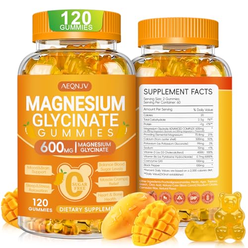 Magnesium Glycinate Gummies 600mg, Chewable Sugar Free Potassium Magnesium Gummies with Magnesium Glycinate, Vitamin D, B6 and CoQ10 for Sleep, Relaxation, Brain & Muscle, 120 Count