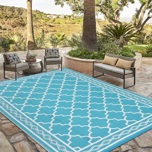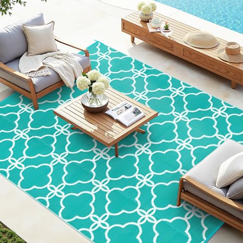 GarveeHome Outdoor Waterproof Rug 10x14 Plastic Straw Rugs Washable Reversible Floor Mat Beige Plaid Carpet for Camping RV Deck Entrance Porch Picnic Balcony Backyard, Teal/White(Geometric)