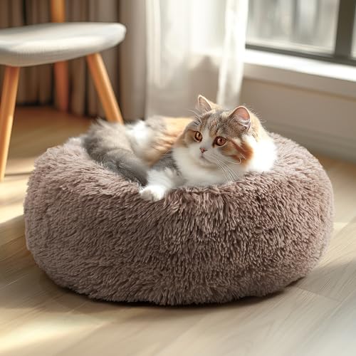 Veehoo Calming Donut Cat Bed for Small Cats Dogs-Round Small Cat Dog Bed, Anti Anxiety Fluffy Faux Plush Cuddler Washable Puppy Bed, Warming Soft Cushion Pet Bed Fits up to 15 lbs Pet, 20", Camel