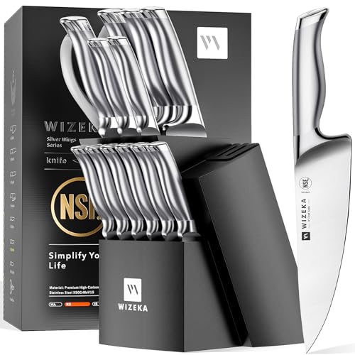 WIZEKA Kitchen Knife Set with Block: 15PCS Easy-Care Knife Block Set with Sharpener, One-Piece German Stainless Steel Kitchen Knives, Silver Wings Series