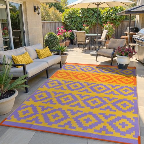 Anidaroel Patio Rugs Outdoor 6x9 Clearance Waterproof, Reversible Plastic Straw Outside Rugs, Outdoor RV Camping Rug for Porch, Balcony, Backyard, Beach, Picnic(Purple&Orange,6‘x9')