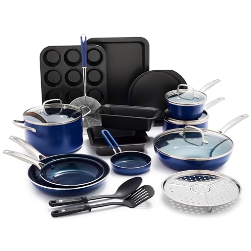 Blue Diamond 20 Piece Nonstick Cookware Set, Diamond Ceramic Pots & Pans, Dishwasher & Metal Utensil Safe, Non Toxic PFAS-Free, Kitchen Cooking Sauce & Saute Pans, Oven & Broiler to 600F, Blue