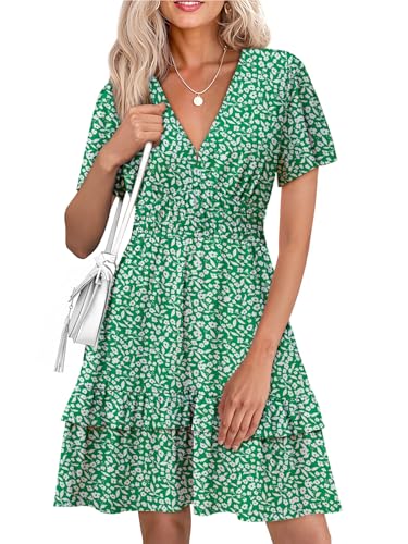 Simplee Womens Floral Short Summer Dress - Empire Waist A Line Flutter Sleeve V Neck Boho Mini Dresses with Pockets Green Floral,L