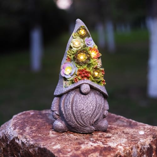 Ovewios Solar Garden Statues Gnomes Figurine with Succulent and LED Lights - Garden Gnome Statues Decorations for Yard, Outside, Patio, Balcony - Gardening Housewarming Birthday Gifts