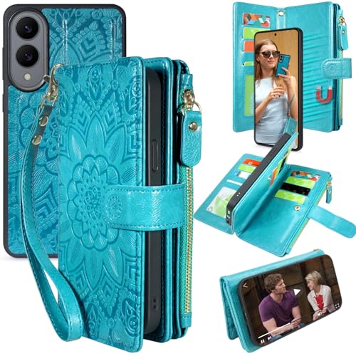 Harryshell Detachable Wallet Leather Case Compatible with Samsung Galaxy S25 Edge Magnetic Phone Case Zipper with Cash Coin Pocket Multi Card Slots Holder Wrist Strap (Flower Blue Green)