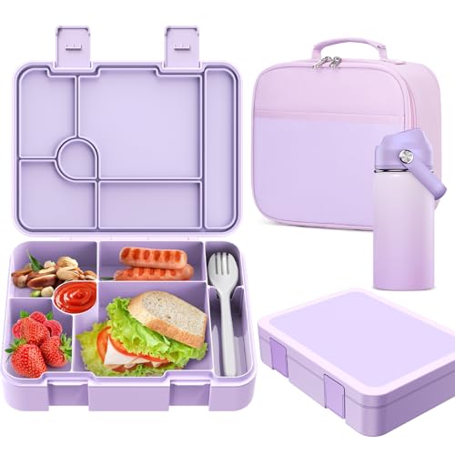Bevalsa Bento Box for School Kids with Insulated Water Bottle Set - 43oz Lunch Containers Lunchbox Bento Box, 14oz Termos Kids Water Bottle, Lunch Bag for School Girls Kid Student (Gradient Purple)