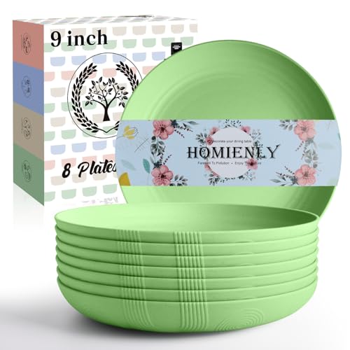 Homienly Wheat Straw Plates,Lightweight Unbreakable Dinner Plates Set 9 inch,Service for 8, Alternative to Plastic Plates Reusable,Microwave and Dishwasher Safe Plate Set for Salad,Dinner(Light Green)