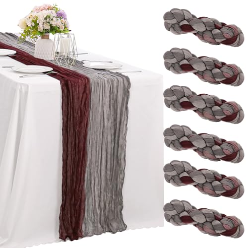 6 Pack 10Ft Cheesecloth Table Runner Boho Gauze Rustic Tie-Dye Long Vintage Romantic Table Runner for Wedding Bridal Shower Party Decor (Grey Burgundy Light Grey Dusty Rose)