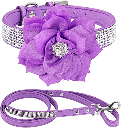 Haoyueer Cute Dazzling Sparkling Elegant Fancy Soft Suede Leather Bling Rhinestone Crystal Jeweled Pet Cat Dog Puppy Collar Dog Leash Combo Set (Purple7, S)