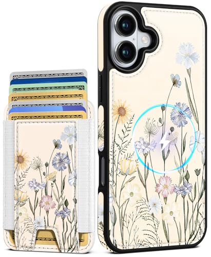 Shorogyt for iPhone 16 Cute Kawaii Phone Case - Compatible with Magsafe Wallet Magnetic Credit Card Holder Color Flower Design Leather Phone Cover for Women Girls, Fits 7 Cards