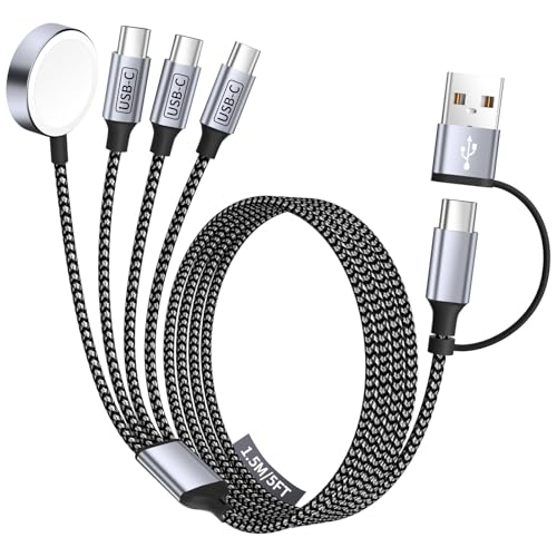 4 in 2 Charging Cable for Apple iWatch Charger with 3 Type-C Ports, Travel Essentials USB C Splitter Multi Charging Cable/Cord for iWatch Ultra/SE/10-1, iPhone16 15 14, Android, More -1Pack 5FT