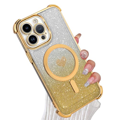 tharlet Magnetic for iPhone 13 Pro Case [Compatible with Magsafe] Glitter Cute Love Luxury Plating Plating Bling Clear Phone Case with Full Camera Lens for iPhone 13 Pro Phone Case, Gold (6.1")