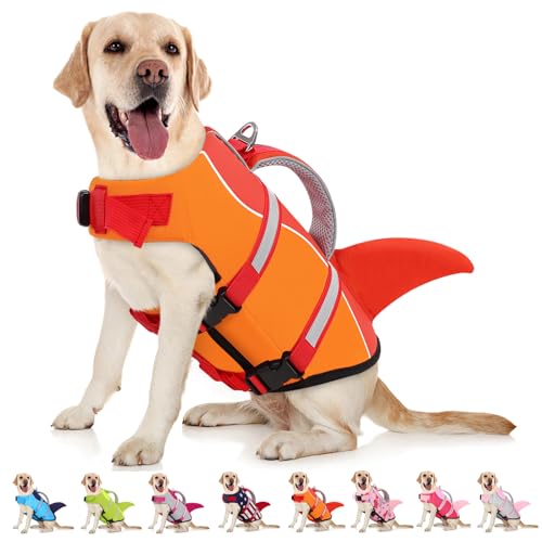 AOFITEE Dog Life Jacket, Dog Life Vest for Swimming, Shark Dogs Swimming Vest with Rescue Handle and Reflective Stripe, Ripstop Pet Float Coat Swimsuit Lifesaver Small Medium Large Dogs Orange L