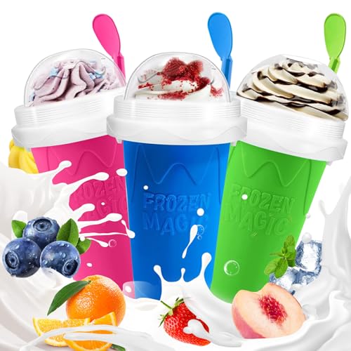 Slushie Cup, 3 Pack Slushy Maker Cup, Frozen Magic Squeeze Cups for Juice Milk Yogurt Ice Cream Make, DIY Smoothie Cooling Cup with Lid & Straw for Kids Friends Family (Blue+Pink+Green)