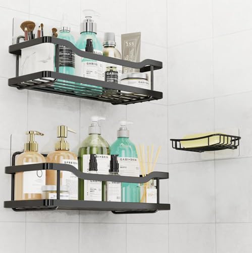 OMAIRA 3-Pack Shower Caddy with Soap Holder, Adhesive Rustproof No-drill Strudy Loading Inside Shower Organizer Shelves Rack Storage Bathroom Organization for Smooth Wall Glass Tile, Black (X-Large)