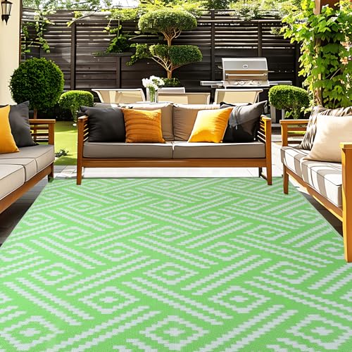 OPPODREAM Outdoor Rug 9x12 Patio Waterproof, Large Outdoor Plastic Straw Rug, Reversible Out Door Carpet for Camping, Deck, Rv, 9 x 12 Area Carpet for Balcony, Porch, Backyard, White and Green