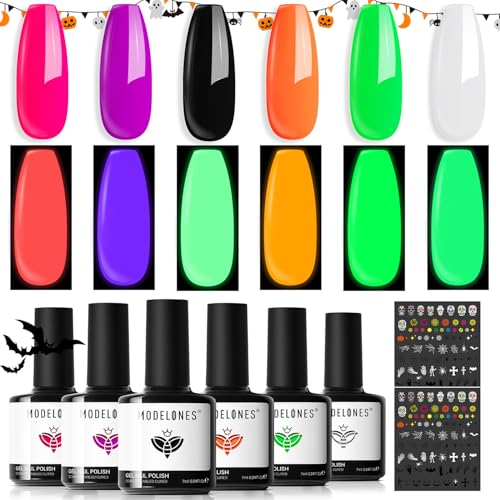 modelones Halloween Gel Nail Polish Set, 6 Colors Glow in the Dark Neon Orange Green Purple Pink White Black Gel Polish Set Fall Soak Off LED Nail Art Kit Gift with Nail Stikers