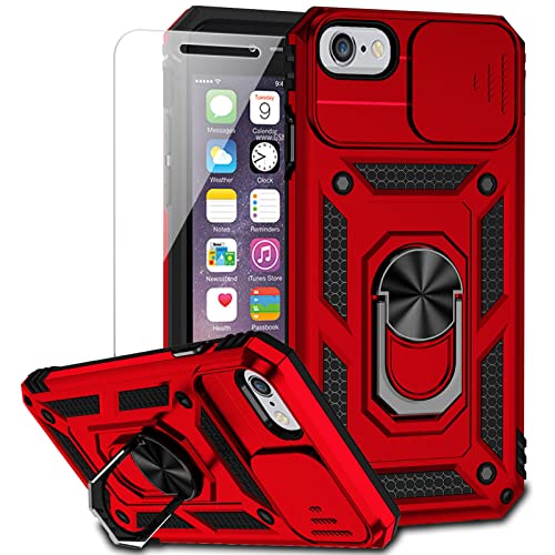 for iPhone SE (3rd and 2nd gen 2022/2020) and iPhone 8/7/6 Case with Camera Lens Cover HD Screen Protector, Military Grade Drop Protection Magnetic Ring Holder Kickstand Protective Phone Case (Red)