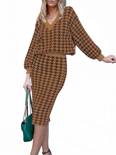Pink Queen Women's 2 Piece Sweater Skirt Set Knit Pufft Long Sleeve Top Bodycon Midi Dress Outfits Cocoa Brown M