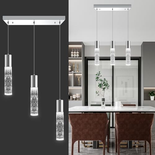 OKELI 3-Light Dimmable LED Pendant Lighting for Kitchen Island, 18W 1350LM Modern Crystal Bubble Island Light Fixture, 6000K Cool White, Adjustable Electro-Chrome Fixture, Easy Install, Square
