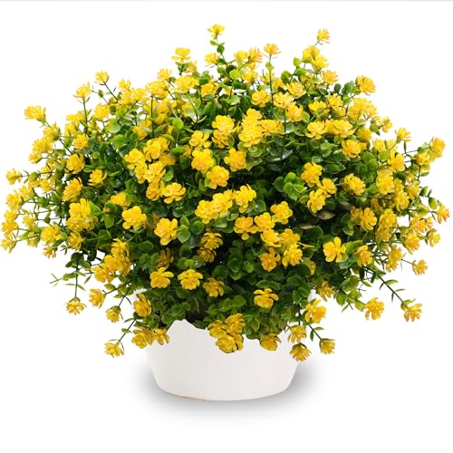 Artificial Fake Flowers Plants for Outdoor, 16 Bundles Faux Eucalyptus Flower UV Resistant Realistic for Planter Front Door Porch Patio Yellow