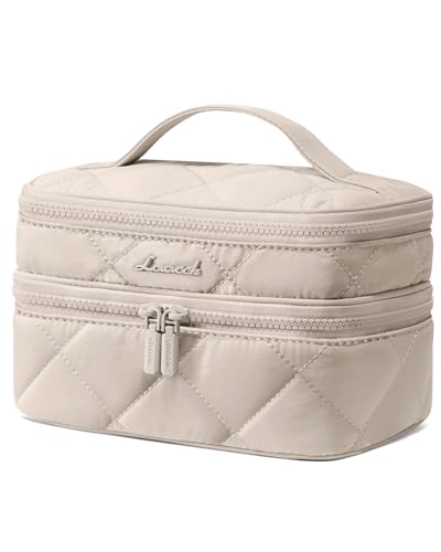 LOVEVOOK Travel Makeup Bag,Large Open Flat Tolietry Bag for Women,Waterproof Portable Cosmetic Pouch,Double Layer Quilted Makeup Bag Organizer With Handle,Travel Essentials,Gift for Her