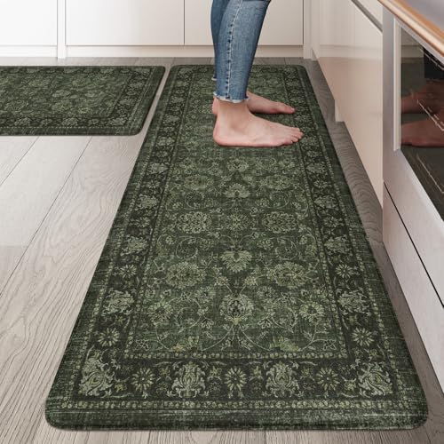 KIMODE Kitchen Mats Cushioned Anti Fatigue, Boho Distressed Kitchen Rugs Sets of 2, 20"x47"+20"x32" Non Slip Kitchen Mats for Floor, Padded Kitchen Floor Mat for Sink Laundry Office Green