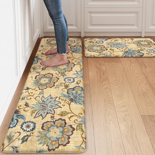 LEEVAN Kitchen Mats for Floor Non-Slip, Cushioned Anti Fatigue Mat 2 Piece, Tan Memory Foam Kitchen Mat Waterproof, Ergonomic Standing Mat for Bar, Office,Desk, Laundry(17.3''x29''+17.3''x59'')