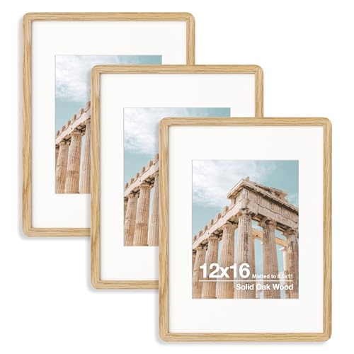 FLYJOE 12X16 Picture Frame | Solid Oak Wood 12X16 Poster Frame | 12X16 Photo Frame With Mat For 8.5X11 | Tempered Glass And Hanging Hardware Included | 16 By 12 Frame Wood (Natural Oak, 3 Pcs)