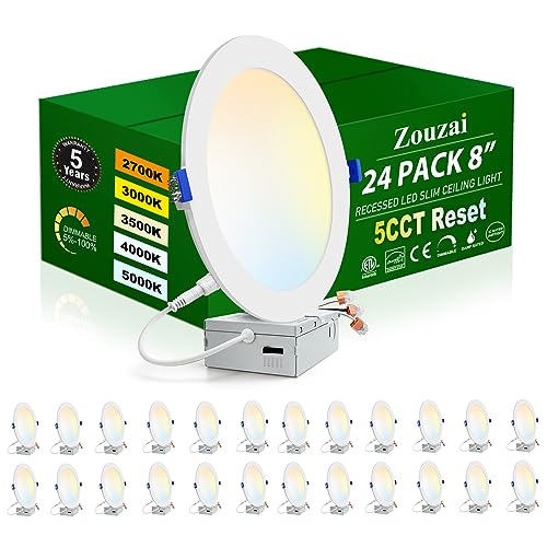 zouzai 24 Pack 8 inch 18W Eqv 150W 1620LM 5CCT Reset Ultra-Thin LED Recessed Ceiling Light with Junction Box, 2700K-5000K Selectable, Dimmable, Commercial and Home use - ETL and Energy Star Certified