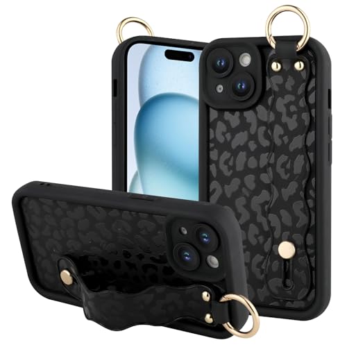 OOK Compatible with iPhone 15 Plus Case with Wrist Stand for Women Girls, Black Leopard Cheetah TPU Shockproof Protection Silm Silicone Kickstand Upgraded Cover, for 6.7inch