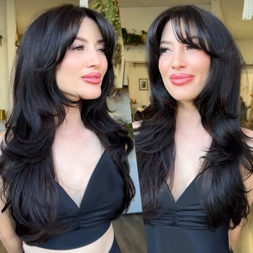 LEOSA Long Black Wig with Curtain Bangs Layered Wig for White Women Natural Straight Wavy Black Hair Wigs Synthetic Wave Layered Black Wig Long Haired Wig with Bangs Natural Wigs for Daily Party Use