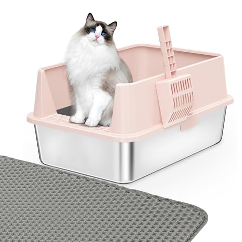 HJWTCQL Stainless Steel Cat Litter Box with Lid XL Metal Extra Large Pink Litter Box Include Cat Litter Scoop & Mat Easy to Clean, Non-Sticky, Anti-Urine Leakage, Never Absorbs Odors (Beige Rose)