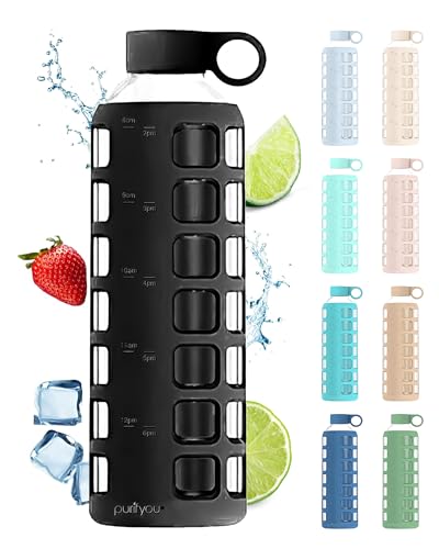 purifyou 40oz / 32oz / 22oz / 12oz Borosilicate Glass Water Bottle with Time & Volume Markers, Silicone Sleeve, Stainless Steel Lid | Reusable Glass Bottle for Water & Juice (40oz Jet Black)