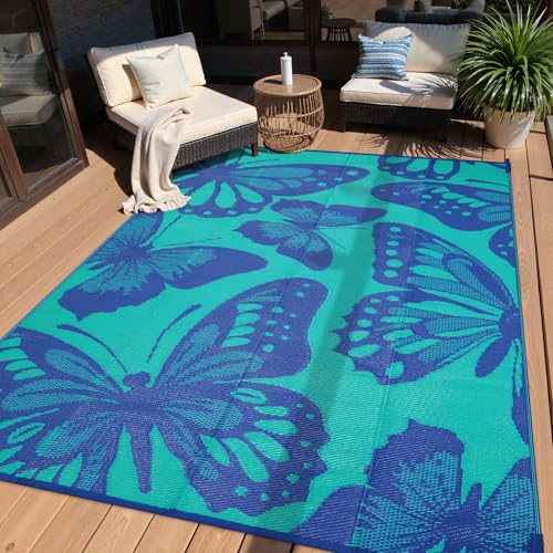Anidaroel Butterfly Outdoor Rug 6'x9' Patio Waterproof, Reversible Plastic Straw Outside Rug, Portable Camping Rugs for Outside RV, Pool Deck, Backyard, Picnic (Purple&Green,6‘X9')