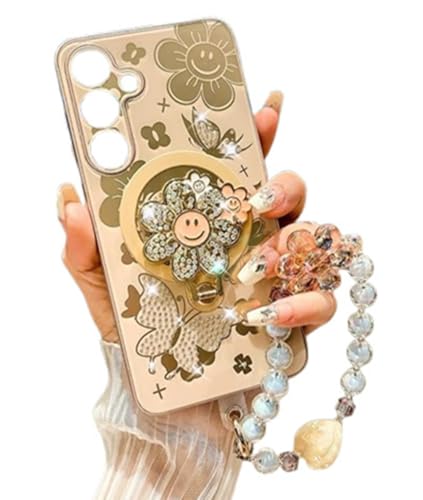for Samsung Galaxy S24 Case for Women Girls for Magsafe,S24 Phone Case Cute Bling Diamond Sunflower Kickstand with Glitter Girly Bead Pearl Phone Strap for Samsung S24 Gold