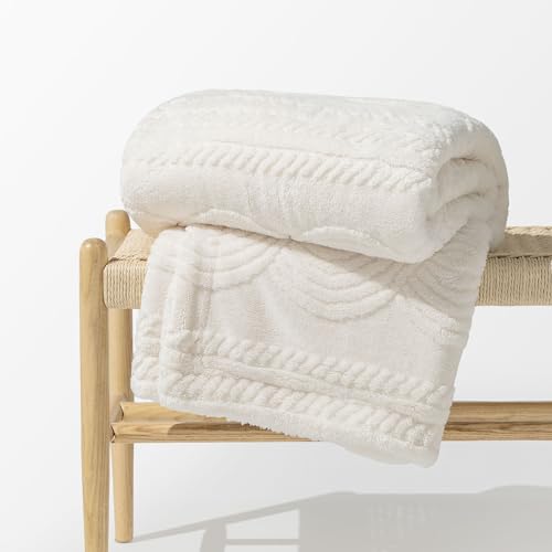 EVERGRACE Cable Jacquard Sherpa Fleece Throw Blanket for Couch, Super Soft Cozy Fuzzy Plush Blankets for All Seasons, Reversible Thick Warm Blanket for Bed, Sofa, Living Room, Ivory White, 50" x 60"