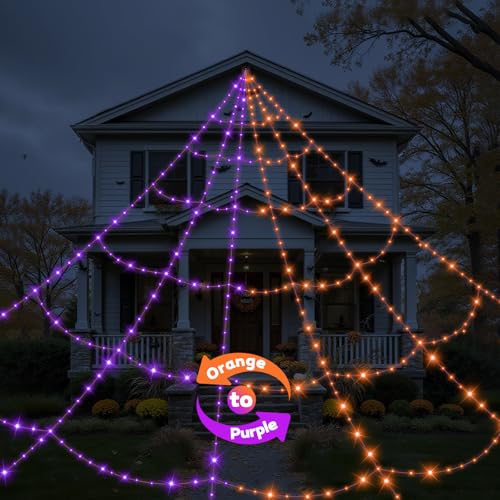 Halloween Decorations Outdoor Spider Web Lights - 550 LEDs Purple and Orange Remote Control Timer Plug in Giant Halloween Decor Cobwebs - 11 Modes Lighting Waterproof Yard Garden Party Decorations