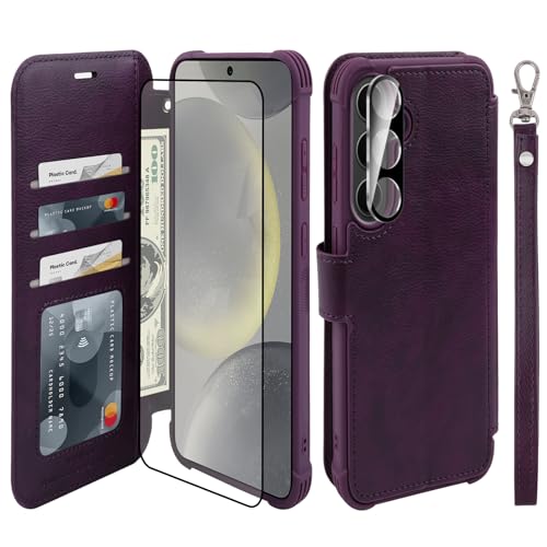 VANAVAGY Wallet Case for Galaxy S24+ Plus with RFID Blocking Card Holder, [Screen Protector & Camera Lens Protector] PU Leather Flip Case Wrist Strap for Wireless Charging, Purple