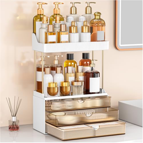 caktraie Bathroom Organizers and Storage - 3 Drawers 2 Tier Makeup Organizer, Cosmetic Storage Drawer for Dresser Countertop and Bathroom Vanity for Large Skincare, Perfume, Amber