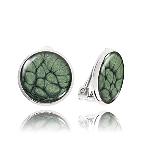 Elegant Small Round Clip on Earrings - Non Pierced Ears for Women (Style N 26 - Calour Khaki Green Silver)