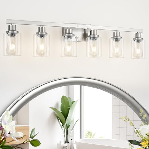 DIKAIDA Bathroom Vanity Light, 6-Light Nickel Modern Matte Wall Sconce Lighting with Clear Glass Shade, Wall Lights,Bath Vintage Wall Mounted Lamps for Mirror Bedroom Living Room
