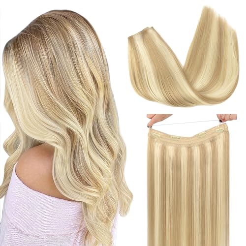 GOO GOO Wire Hair Extensions Human Hair, 18A/613A Dark Blonde mix Bleach Blonde Highlighted 12inch 70g, Invisible Wire Hair Extensions with Transparent, Seamless Fish Line Hairpiece