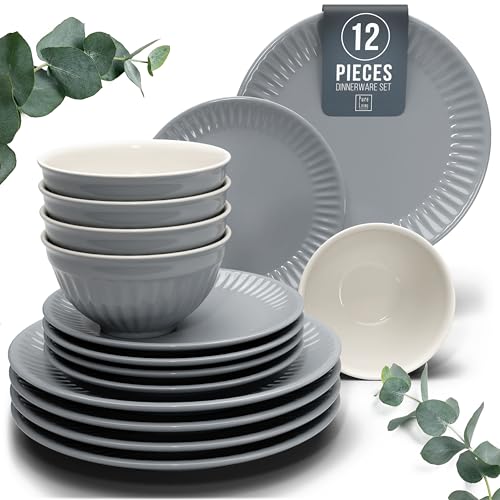 Stoneware Dinnerware Set for 4 People HYGGE 12-Piece - Elegant Scandi Design - Premium Dish Set - Bowl and Plate Set - Tableware for 4 People in a Ribbed Design - Pure Living in Gray-Blue