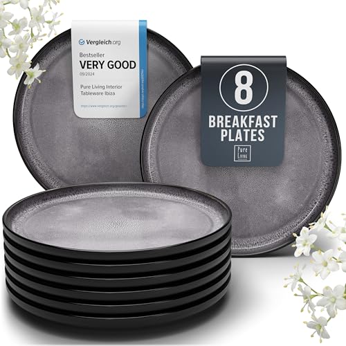 PURE LIVING INTERIOR DESIGN Stoneware Breakfast & Dessert Plates Set of 8, Stylish Dark Gray Small Plates, Dishwasher, Microwave & Scratch-Resistant Salad & Cake Plates