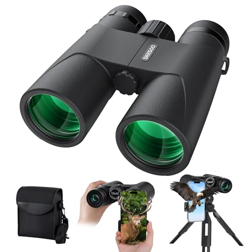 12x42 HD Binoculars for Bird Watching - Deesoo Easy Focus Waterproof Binocular with Phone Adapter and Tripod, Clear Low Light Vision Binoculars for Adults High Powered Hunting Travel Concert
