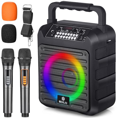 Karaoke Machine with 2 Rechargeable Wireless Microphones, Portable Karaoke Machine for Adults Kids, Portable Bluetooth Speaker with Microphone,Karaoke Speaker Supports for USB,FM,REC,AUX in,TF Card