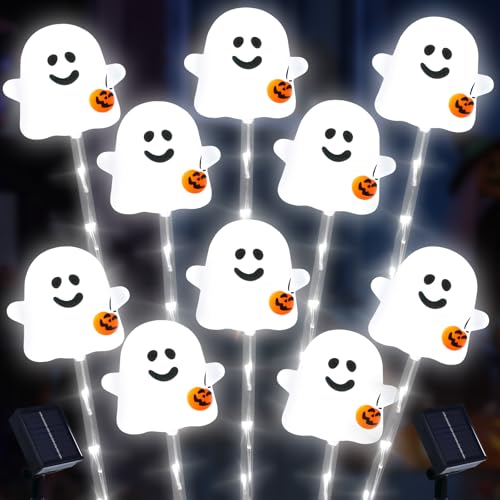 Solar Halloween Ghost Pathway Lights, 10 Pack - Outdoor Ghost Stake Lights with Pumpkin Design, Solar Powered Auto-On, Waterproof Halloween Decor for Garden, Walkway, Yard, Party (Transparent)