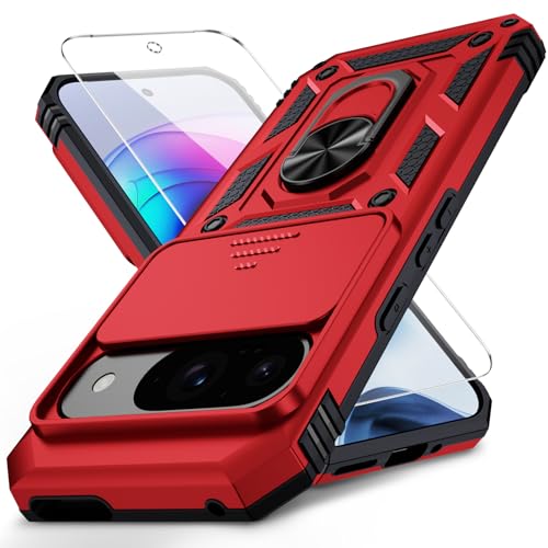 for Google Pixel 9 Case, Pixel 9 Pro Case, Slide Lens Cover, HD Screen Protector, Military Grade Drop Protection, Magnetic Rotated Ring Holder Kickstand Protective Phone Case (Red)